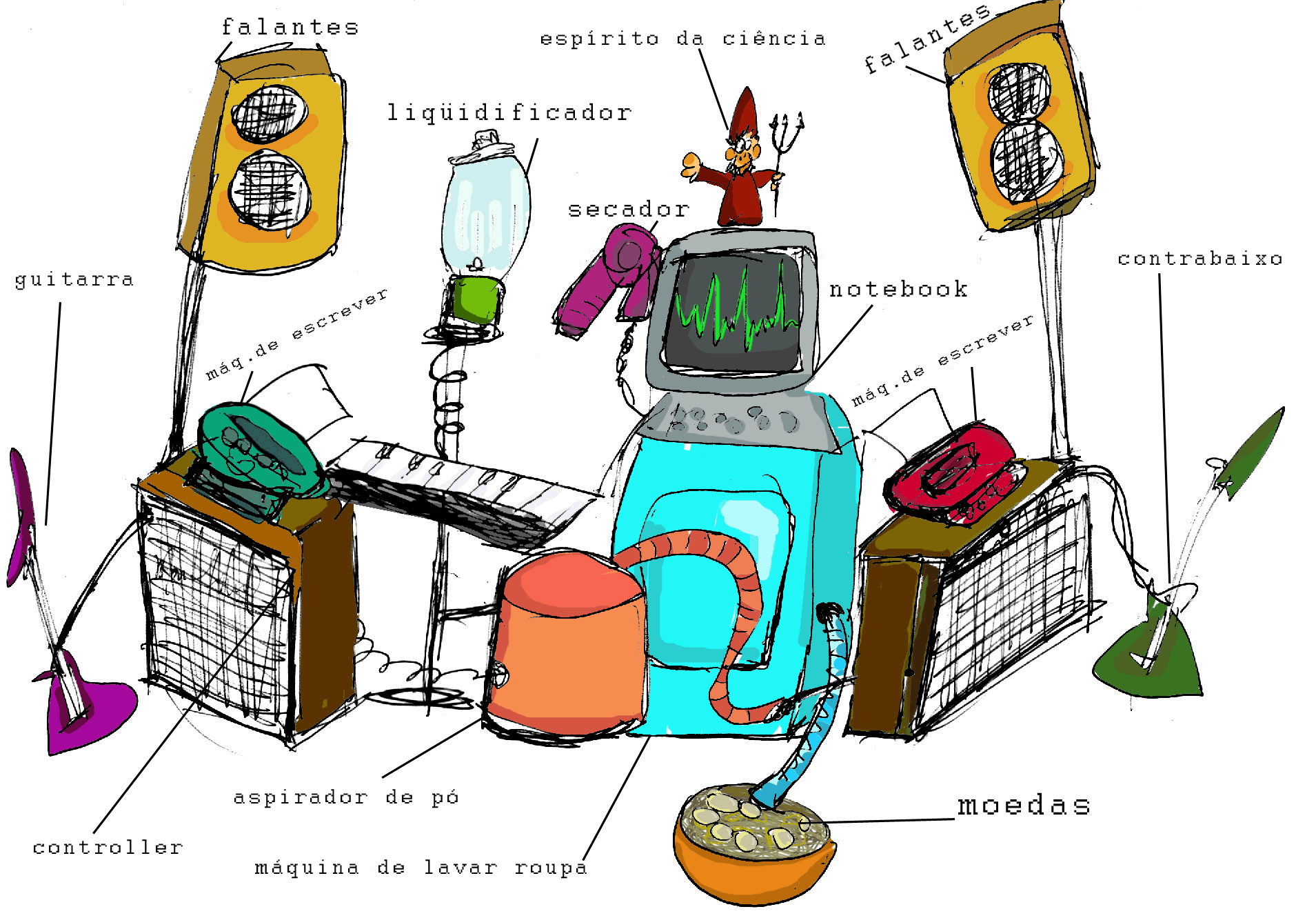 A máquina está montada ali. No meio da sala. Faz barulhos estranhos. Perdi um tempão descobrindo timbres e inventando batidas pra tocar junto com ela. 7 toca teclados. Eu toco guitarras. 7 tem um clarinete mas a gente só faz barulho nele. Enquanto isso a máquina cospe moedas de latão que a gente fica dando marteladas com uma marreta velha. Tem um esmeril que quando a gente apaga a luz solta faísca de tudo quanto é cor. Plasticamente é bonito e diferente. Conceitualmente… ah…conceitualmente vá tomar no cu…Qual teu real valor?? 7 pessoas compareceram à nossa estréia. O numero 7 fica lisonjeado. Eu decepcionado. 3 amigos e mais minha mãe, minha avó e o síndico do prédio que veio encher o saco achou engraçado e acabou ficando. Ah. São 6, né. Desculpe, 7 é que eu estava contando você. Número, números. Esta merda de números. Toda vez que a gente tem uma idéia genial devia cair automaticamente um doc de dois mil reais na conta corrente. Assim não tinha que me preocupar com essa história de popularidade. Eu simplesmente teria as idéias, executaria pra mim mesmo e pronto, Uau. Sou demais. Mas não, vocês têm que gostar se não eu vou ter que ir trabalhar. Gerente de marketing de uma fábrica de baldes. Webdesigner de um portal de equipamentos de natação, assesoria de imprensa de empresa de cosméticos. Salário no fim do mês. Simples. E medíocre. Prefiro minha cruz de ponta cabeça. Sigo a temporada por mais três semanas. Vendi meu computador pra comprar latão. To sem grana, mas tem sido divertido. As pessoas do circuito underground sabem que eu sou "o maluco da máquina de moedas". Eu sempre me divirto. Cada ritual da máquina pra mim é sagrado. Já deu 20 pessoas uma vez. Arte é assim mesmo… Nietzche já dizia que o artista só precisa de seu pão e do seu circo… nós livres, nascemos póstumos, Battaille já falava que a parte maldita da economia não nos cabe e… 7 me diz que vão cortar a luz. Puta que pariu. Sem luz não tem show. Fudeu. Porra…Como eu poderia imaginar que sou um funcionário da Eletrobrás antes de tudo?? Eu existo pra manter funcionando todas aquelas usinas, cheio de carinhas de capacetes que sustentam suas crianças que gastam muita luz punhetiando no chuveiro quente. Pra destruirem mais algum santuário ecológico que com certeza dá menos grana com turismo do que com a possibilidade de serem ligados mais e mais equipamentos eletrônicos. Televisão não vejo a um ano. Só sem querer, na casa dos outros. Todo mundo fala mal de televisão, mas vê. Não posso falar nada… antes de vender meu computador, eu ficava lendo blogs, é a mesma coisa que ver novela. Todo mundo escreve. Todo mundo toca violão. Todo mundo desenha. Quem é algo pra julgar o que é bom? A história? Do ponto de vista de quem? Dos acadêmicos e curadores protegidos atrás de sua teia totêmica de referências? O mercado? Suas imposições massificadas e pasteurizadas por sua industria, suas revistas de entretenimento e segundos cadernos de jornais cheios de críticos que cagam regras baseados na imprensa anglo-saxônica e seus cds, biografias, catálogos caros e importados com sua coleção de adjetivos e referências do momento? A virtude técnica? A escravidão altista e masturbatória presa num labirinto hermético de auto adoração, onde por um segundo de desatenção do público perdem-se detalhes de anos de treinamento e disciplina? Meus senhores. Eu cuspo. Cuspo no prato em que comi. A arte que se foda… Vou trabalhar. Me vender como todos eles. Ter dinheiro pra pagar minha língua. 7 quer me consolar. Faz uma piada. Diz que estamos cheios de dinheiro. Mostrando o chão cheio de moedas que cunhamos. Merda. Tive outra idéia.